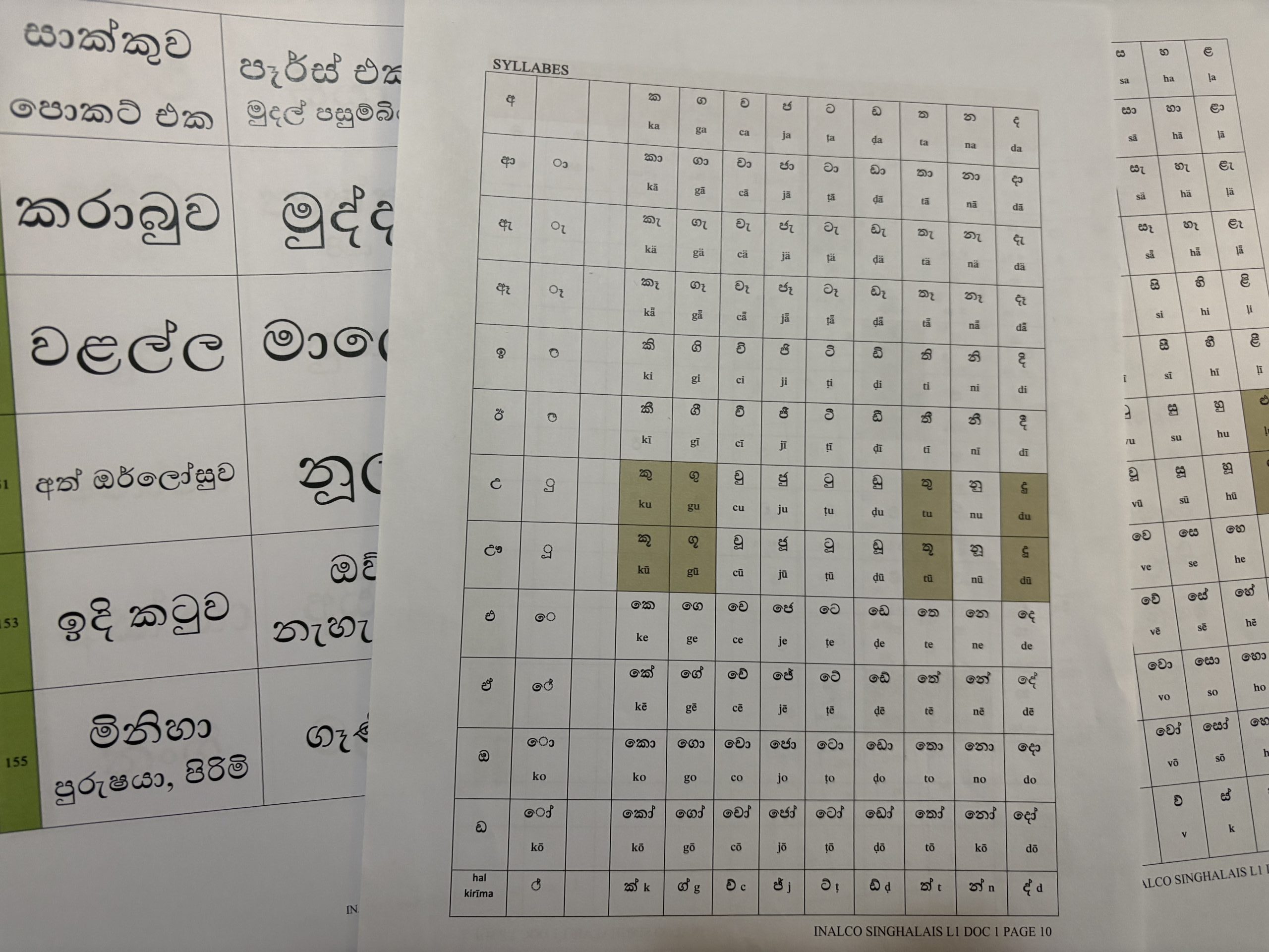 冒頭で「休暇明けに試験がある」と書きましたが、このバカンス中の大きな課題が、シンハラ文字を全部覚えることでした。今学期履修している言語のひとつ、スリランカで話される言語です。