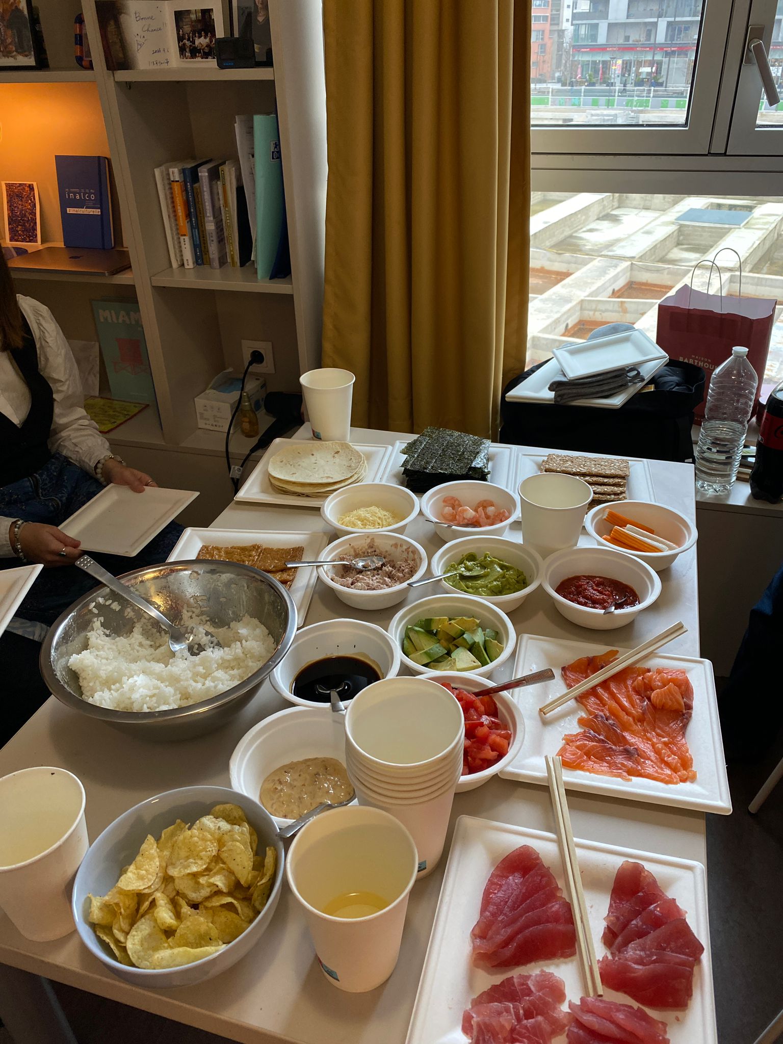 フランス人の友達も来る予定だったので、お寿司だけではなく、トルティーヤ・アボカド・トマトなども用意してみました。当日は自分の好きなケーキも買いに行き、朝から友達と料理の準備をしました。