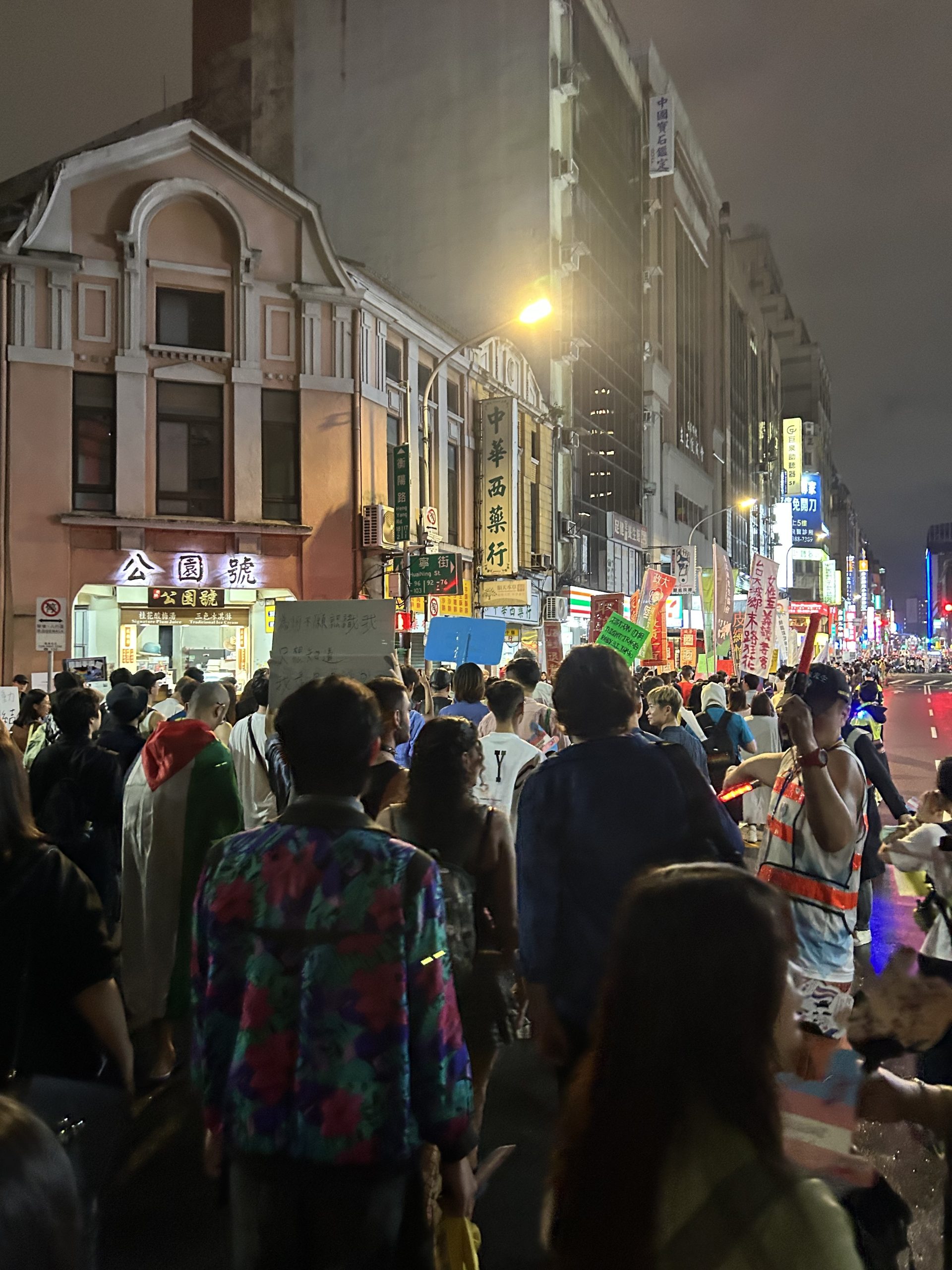 マーチを終えて228公園に戻り、夜ご飯を食べようとしたものの……翌日にプライドパレードが控えていたこともあり、台北は大賑わい! そのため、なかなか空いているお店が見つからず、西門を彷徨い、なんとかご飯にありつけました。この時期に台湾に来る予定の方、マーチやパレードに参加する予定の方は、レストランなどを事前に予約をしておくと安心かもしれません!