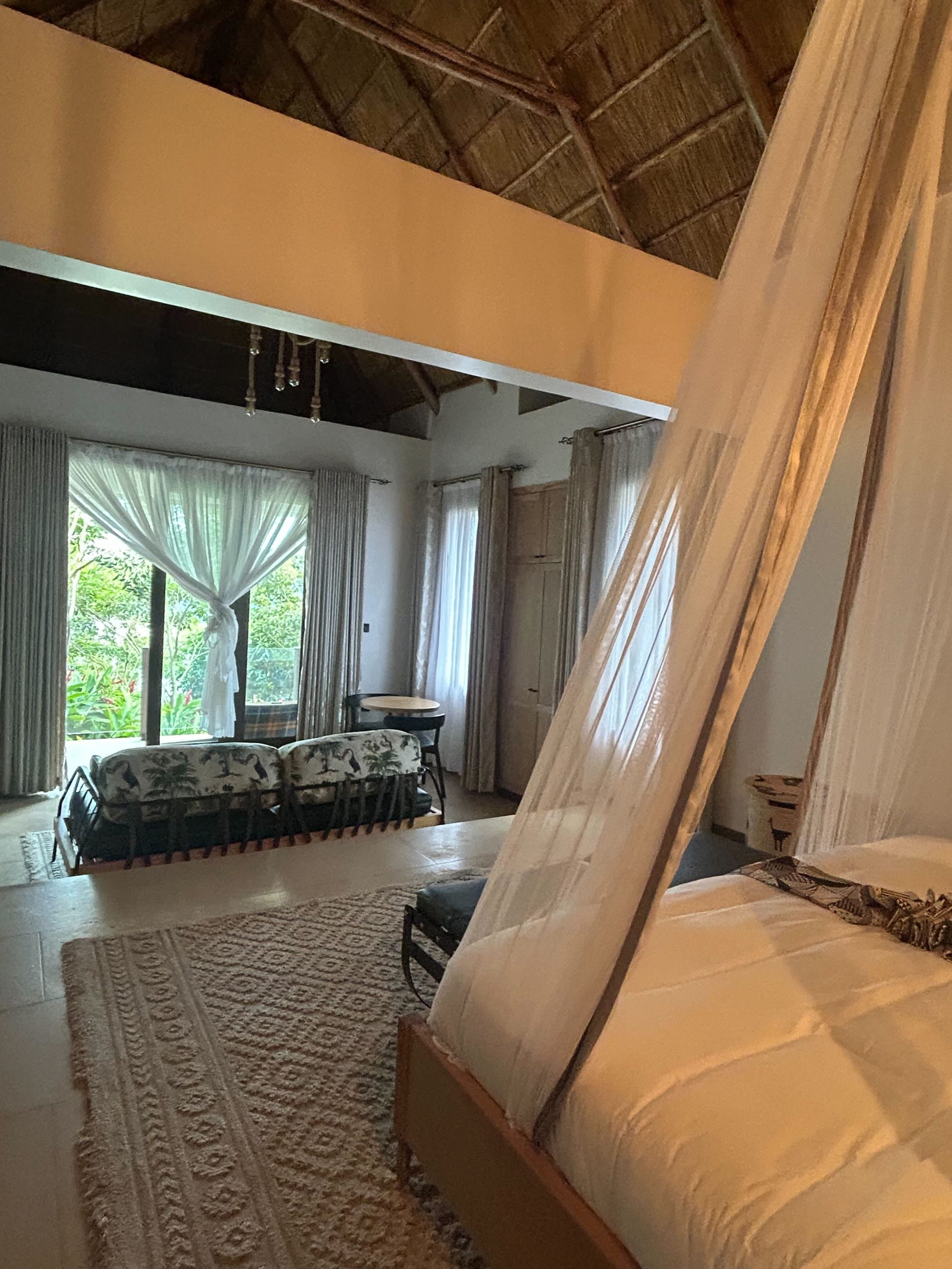 ウガンダで私が宿泊したホテルの中でも最高だったのは、湖の目の前にあるホテル。ウェルカムドリンクで迎えられると、案内されるのは緑に囲まれた広々としたコテージ。全客室がコテージとなっているため、プライバシーが守られています。