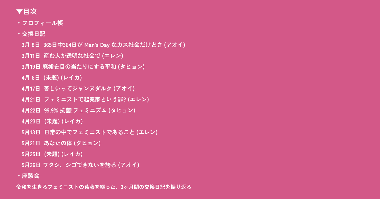 卒業後、彼女たちは日本、韓国、オーストリア、アイルランドと世界各地へ。離れ離れになっても、止まることのない性差別的なニュースや、日々直面する葛藤。それらを共有するために選んだのが、かつて少女たちが「秘密」を共有したツール、「交換日記」でした。