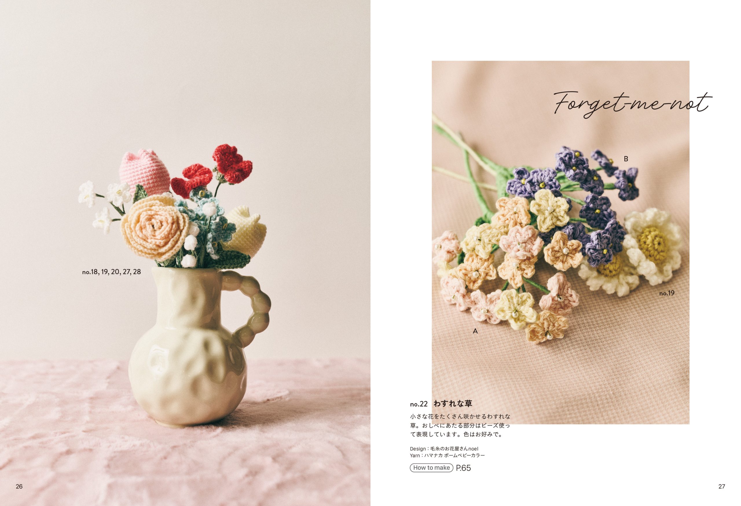 チューリップやバラ、さくらといった花から、ラベンダーやユーカリといったハーブまで、36種ものコットンフラワーの作り方が掲載されています。いまYouTubeで人気の編み物作家さんが提案するモチーフで、トレンドを押さえたデザインがかわいらしく、アレンジ力も抜群です。