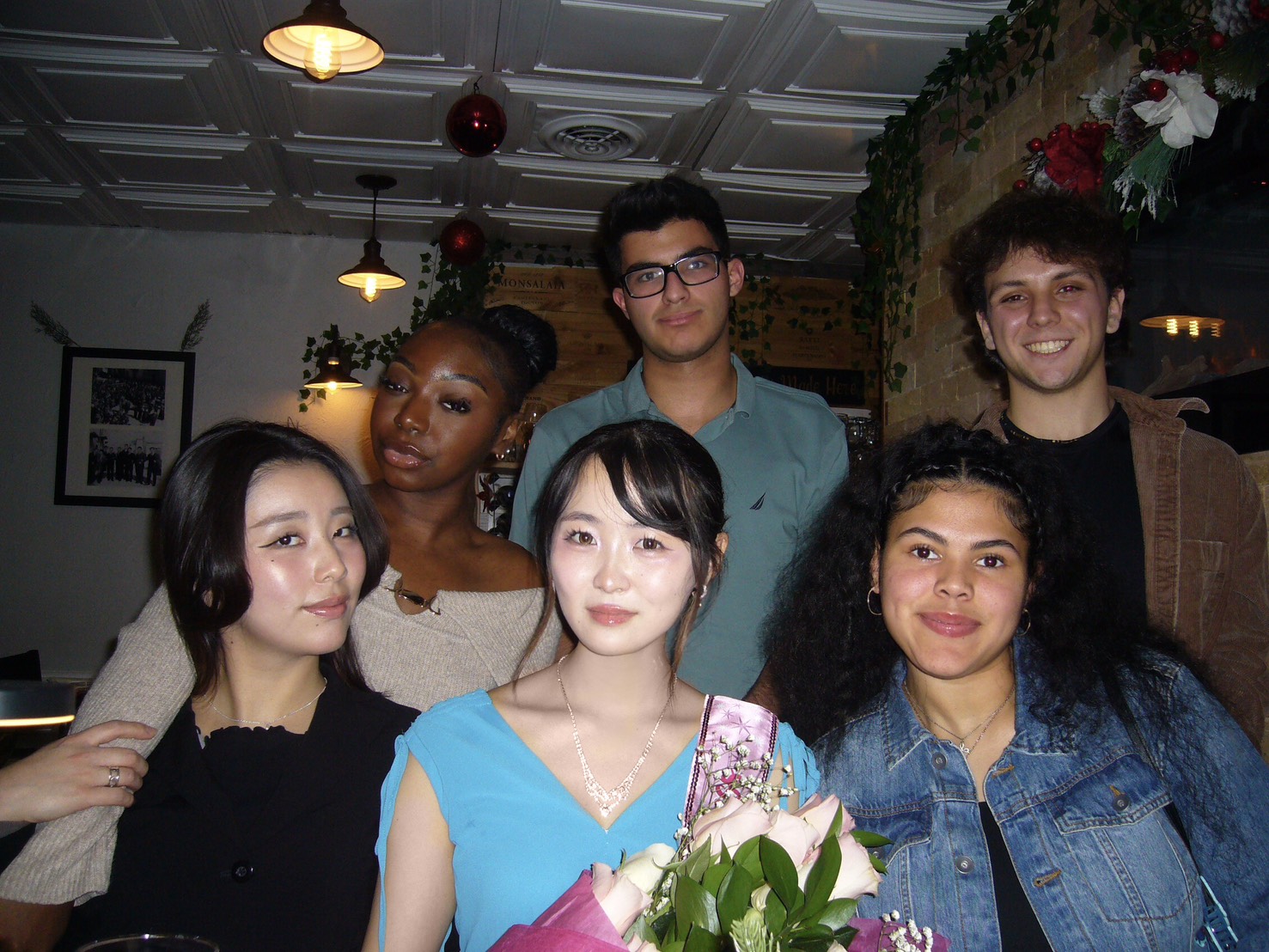 ディナー会場へ行く準備をしていたところ、「ドレス着てみなよ! 」と言われ、ダンスの衣装から急いで着替え、メイク直しとヘアセットを済ませて外へ。ニュージャージー州の12月の平均気温は3.6℃。薄着だったわたしには、当然のように身にしみる寒さでした。レストランへと到着すると、とても可愛い店内が目に入り、「わたしの誕生日を祝うために、頑張って調べてくれたんだ……」と感動して寒さも吹き飛びました。さらに、寮の友人たちの姿が! ダンス部のメンバーがわたしの友人に声をかけて集めてくれていたのでした。