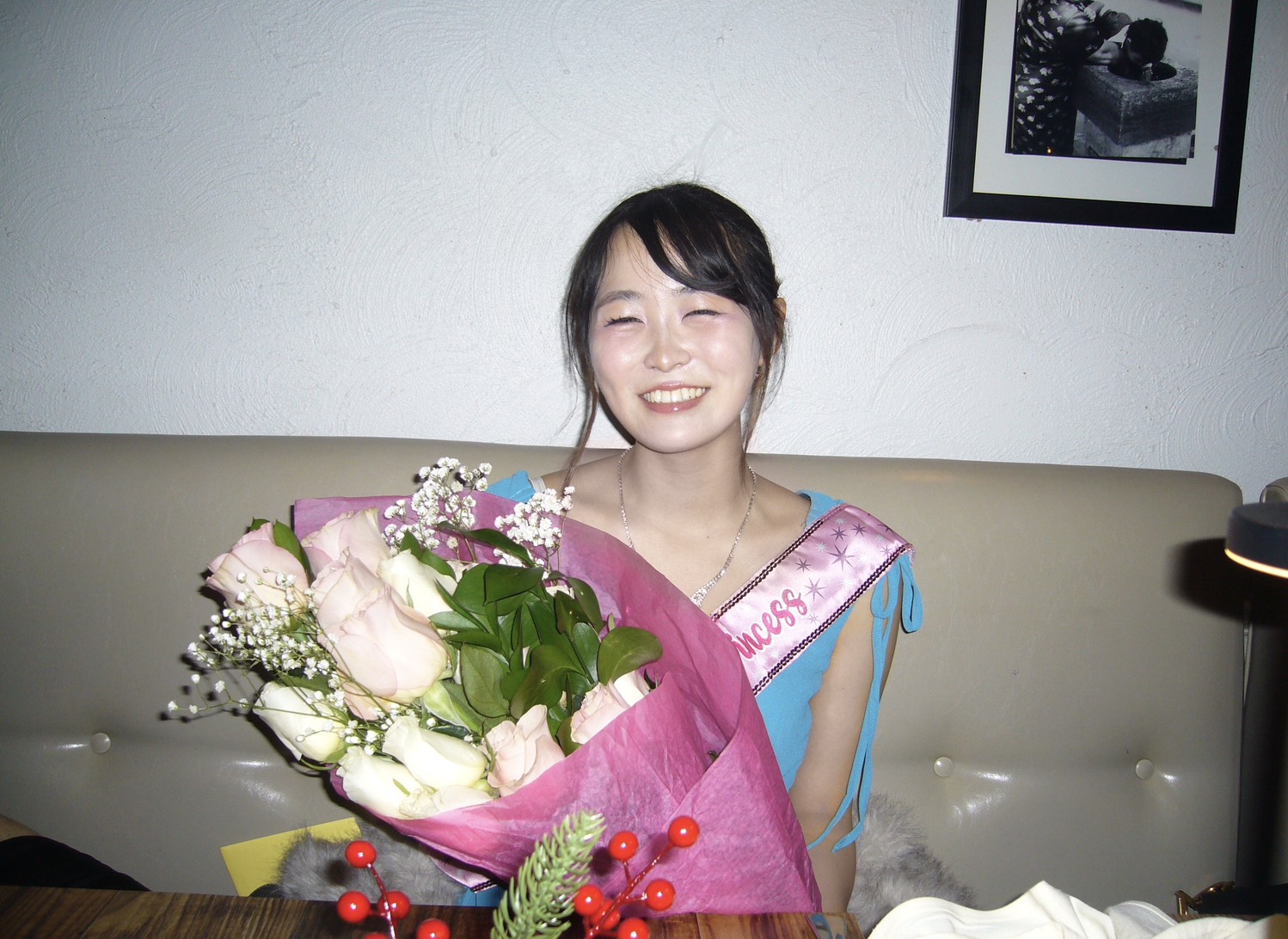 テスト期間であるということなどすっかり忘れ、薔薇の花束を抱えて外で写真撮影をしました。寒さに震えながらも、楽しさと嬉しさに満たされ、気付けばベッドに入るのが朝の5時になっていました。