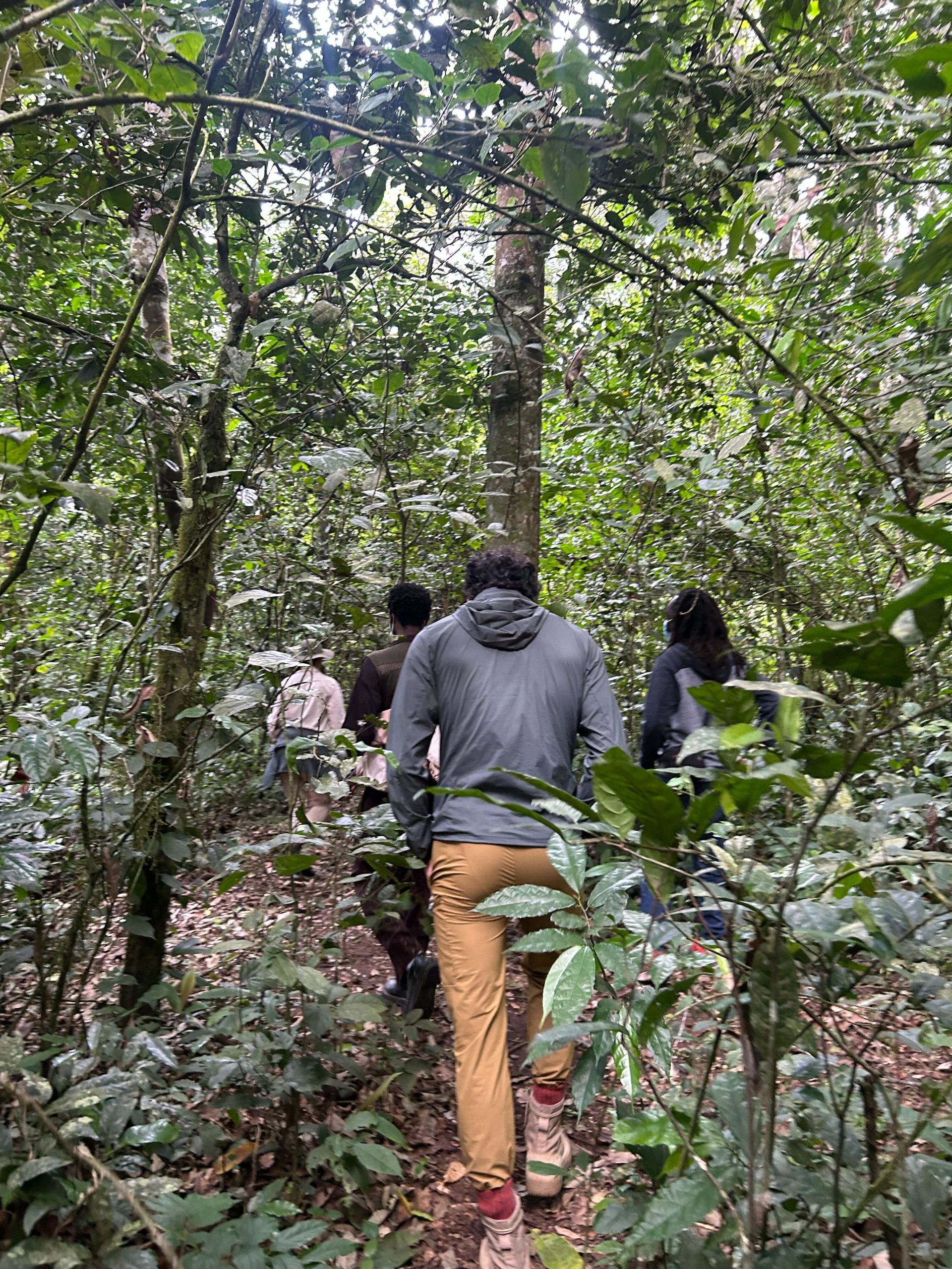 チンパンジーは50〜100頭ほどの群れで生活しているそうですが、トレッキング中にチンパンジーと出会える確率は約9割。ウガンダ人のガイド1人と、私と友人を含む10人ほどでひとつのグループとなり、チンパンジートレッキングが始まりました。