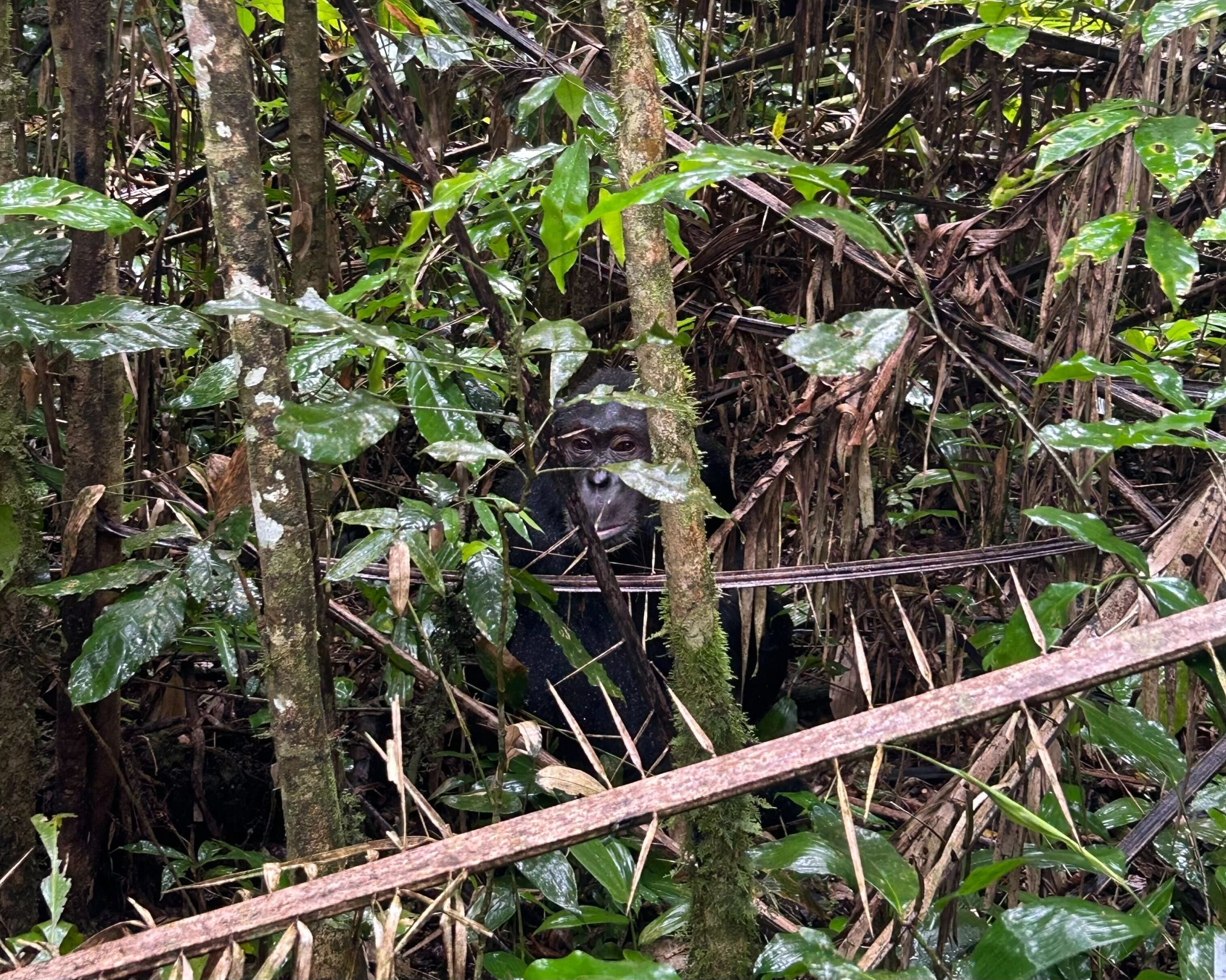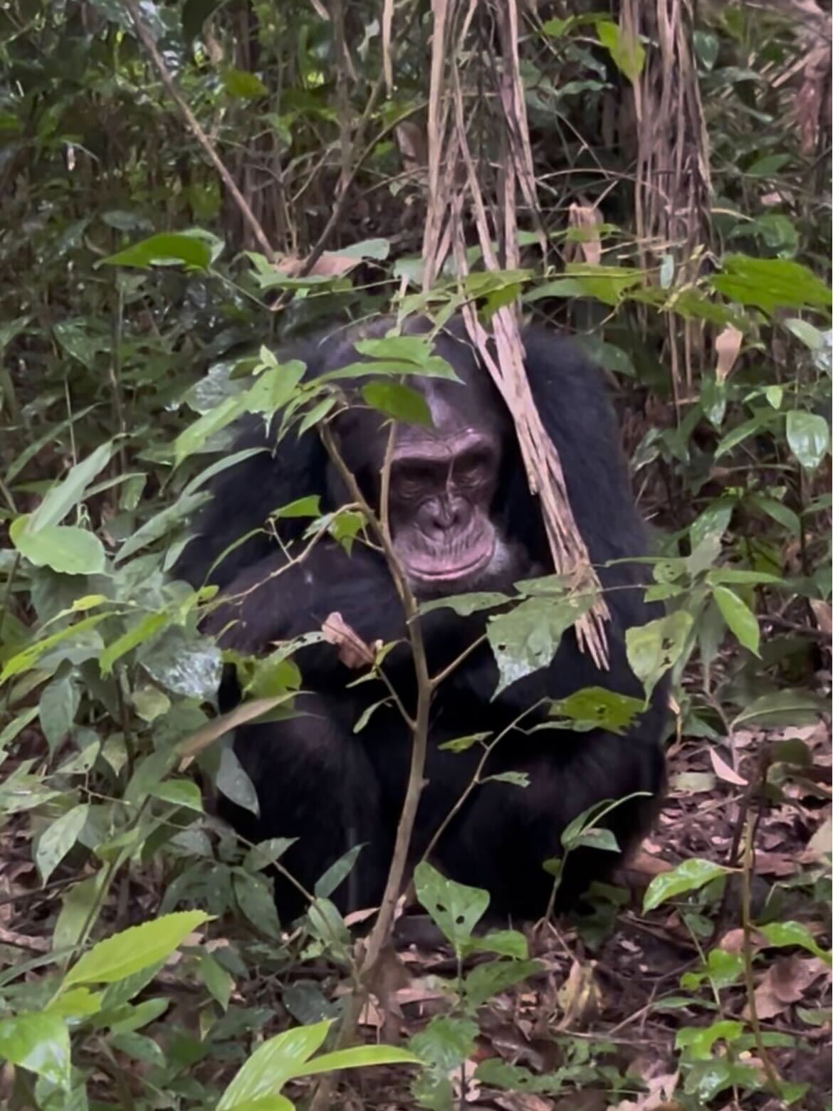 私たちはチンパンジーと1メートルにも満たない距離まで近づくことができました。間近にチンパンジーを見ると人間に似た茶色の純粋な目を持っていて、、仕草も人間にそっくり。