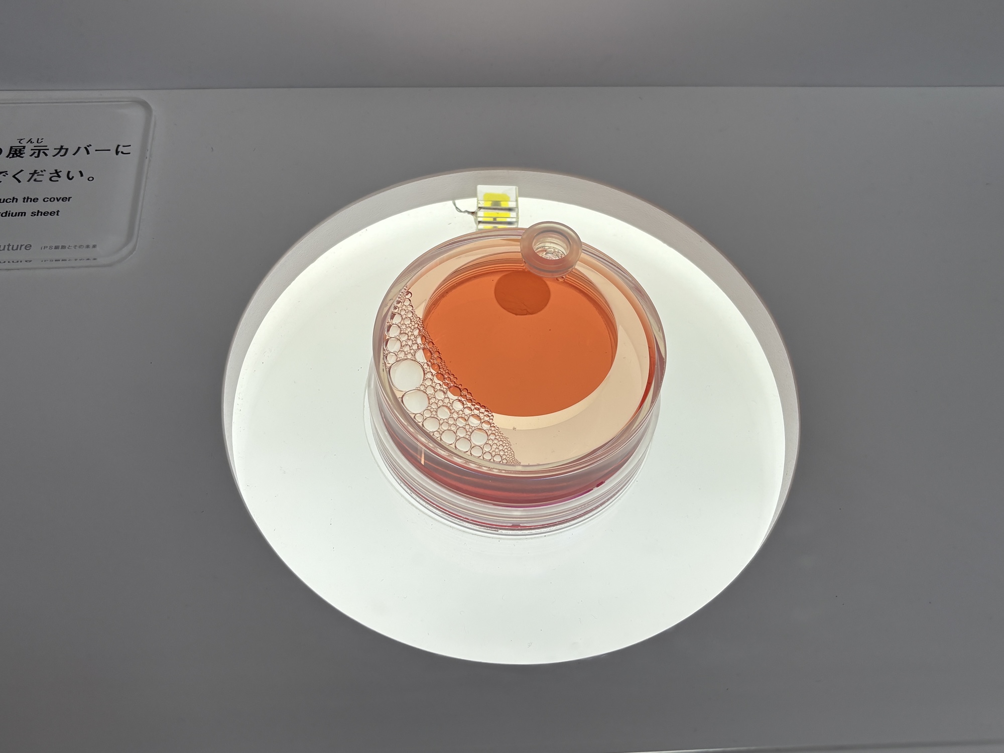 また、先日、厚生労働省により実用化が承認されたばかりの、ヒト iPS 細胞を心筋細胞に分化させて作り出した「心筋シート」も展示されています。なにものでもなかった細胞が心筋細胞になり、拍動する姿は神秘のひと言です。