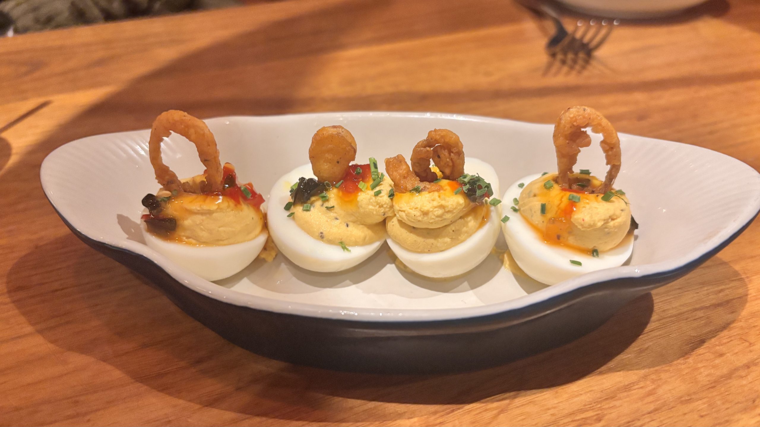 例えば、Shrimp and Grits。これはとうもろこしをすり潰し、ペースト状にしたものに海老を乗せ、グレービーソースをかけたものです。いままで食べたことのない食感で、お粥に近いように感じました。次にDevil’s egg。代表的な卵料理なのですが、白身は普通のゆで卵のように調理し、黄身は調味料を混ぜたのち、ムース状にして、白身に戻し、オニオンリングなどをトッピングします。こちらはアメリカ南部では、アペタイザーのような役割のようで、手軽に食べられる一品です。