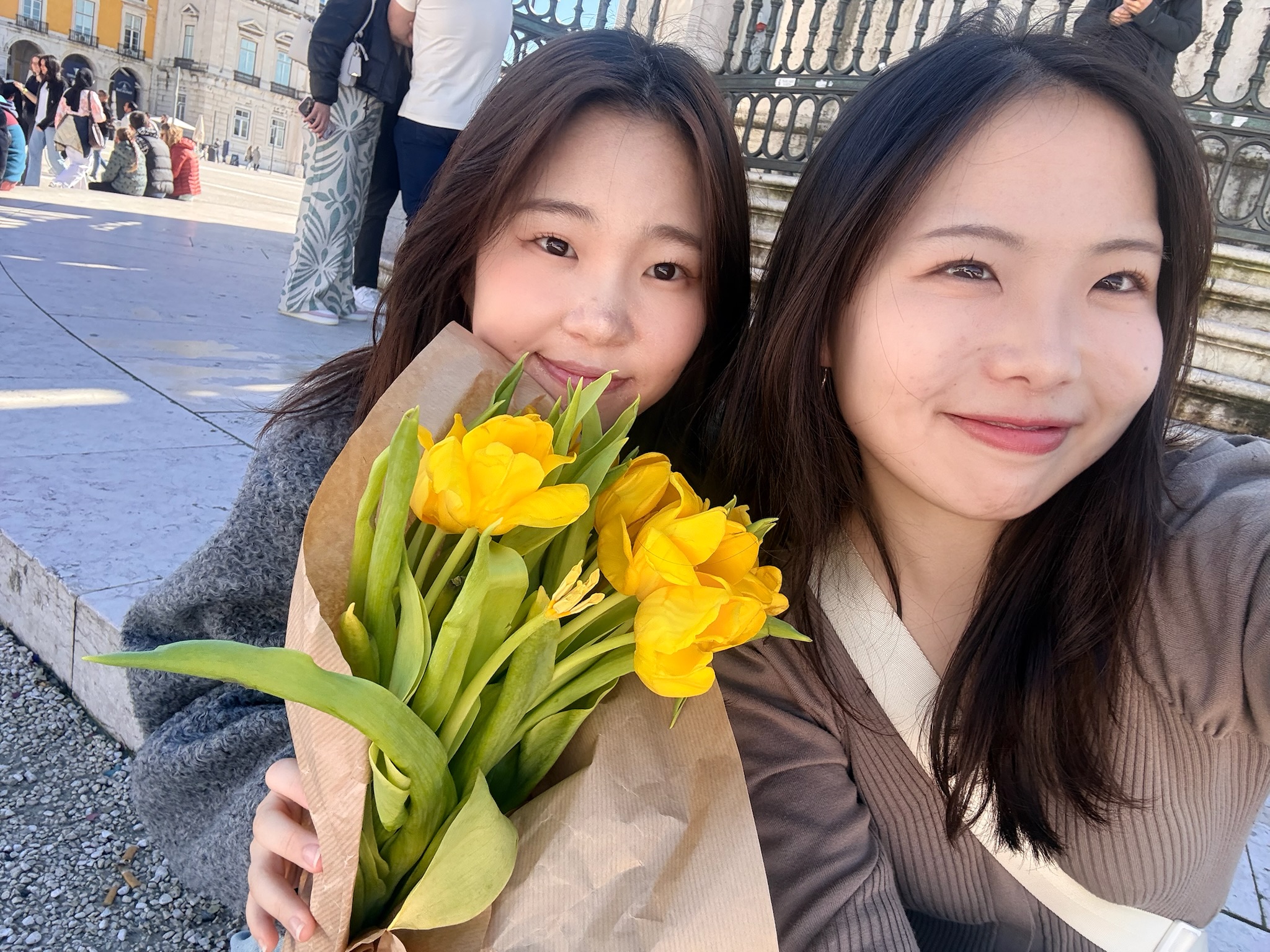 リスボンはポルトガルの首都。歴史的建造物の並ぶ港町です。リスボンの海沿いの公園を散歩していたときのこと。突然声を掛けられ、黄色い素敵なお花をプレゼントしてもらいました。思いがけないサプライズにテンションが上がり、友人と一緒にたくさん写真を撮りました(笑)