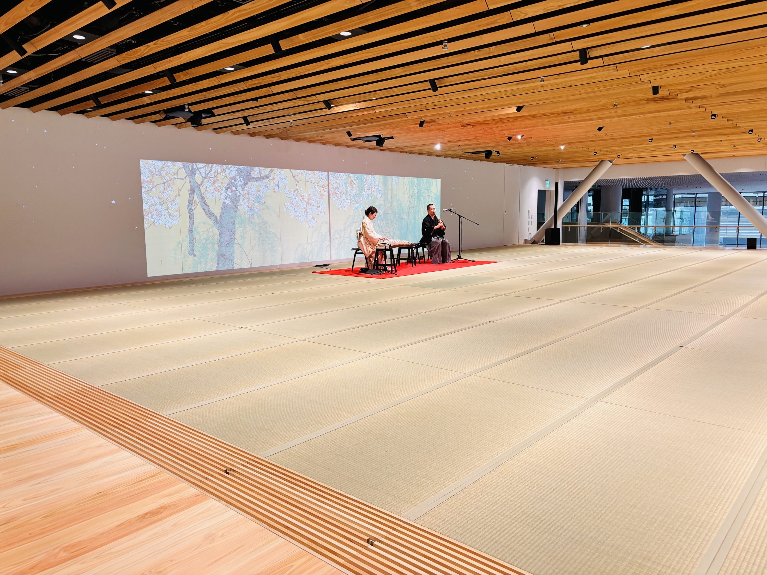 4階にある100畳の畳敷きのスペースはその名も「Tatami」。和文化とテクノロジーが融合した体験を、靴を脱ぎ、くつろいだ状態でできるユニークな空間です。畳の芯材には伊藤園「お~いお茶」の茶殻をリサイクルした素材が使われており、消臭効果が期待できるのだそう。