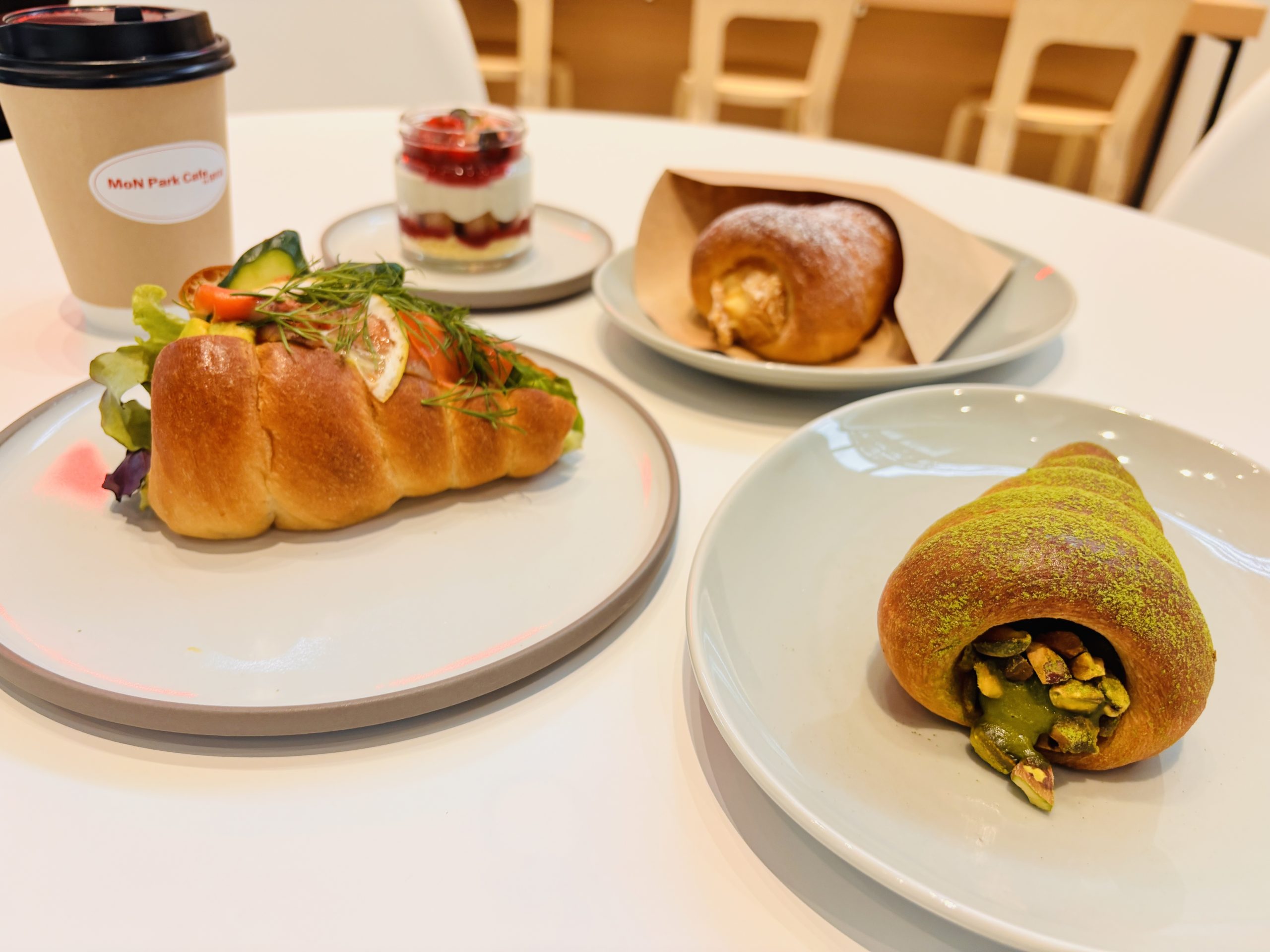 1階にある「MoN Park Cafe by Spiral」は、テイクアウトスタイルのカフェ。提供されるのは、MoN Takanawaのロゴをイメージさせるオリジナルパン「スパイラルコロネ」! クリームが入った甘いものだけでなく、コロネをサンドイッチにしたタイプもあり、コーヒー片手に休憩するのにぴったりです。館内には他に、3階、6階に飲食店舗があり、それぞれこだわりの味を楽しむことができます。
