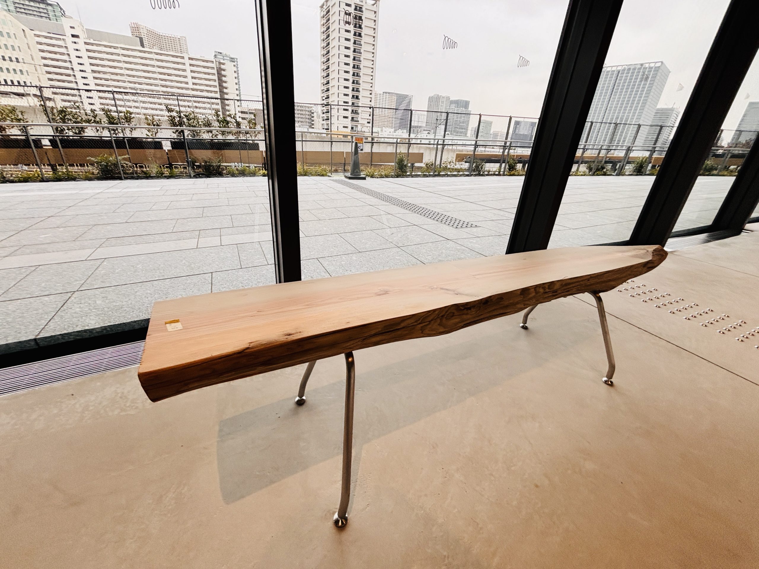 これは、高輪海岸沿いの海上に鉄道を走らせるために、「高輪築堤」を作った際にマツの木の杭を打ち込んでいたもの。今回の再開発で出土した杭をアップサイクルしベンチへとよみがえらせています。他にも鉄道の安全運航のために生やしていた「鉄道林」の木材から作ったベンチなどもあるので、よく見てみてくださいね。