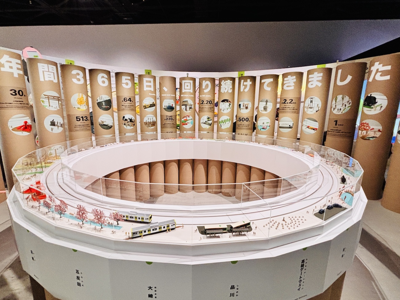 続いて「Zone 3|City:ぐるぐる動くまちと暮らし」では、私たちの生活の中の「ぐるぐる」に焦点を当てています。東京の街の中で「ぐるぐる」といえば、山手線を外すことはできません。建築模型を販売しているテラダモケイによる「山手線」は、TASKO とGakki Lab.が設計製作した紙の模型の電車が各駅をつないでいます。