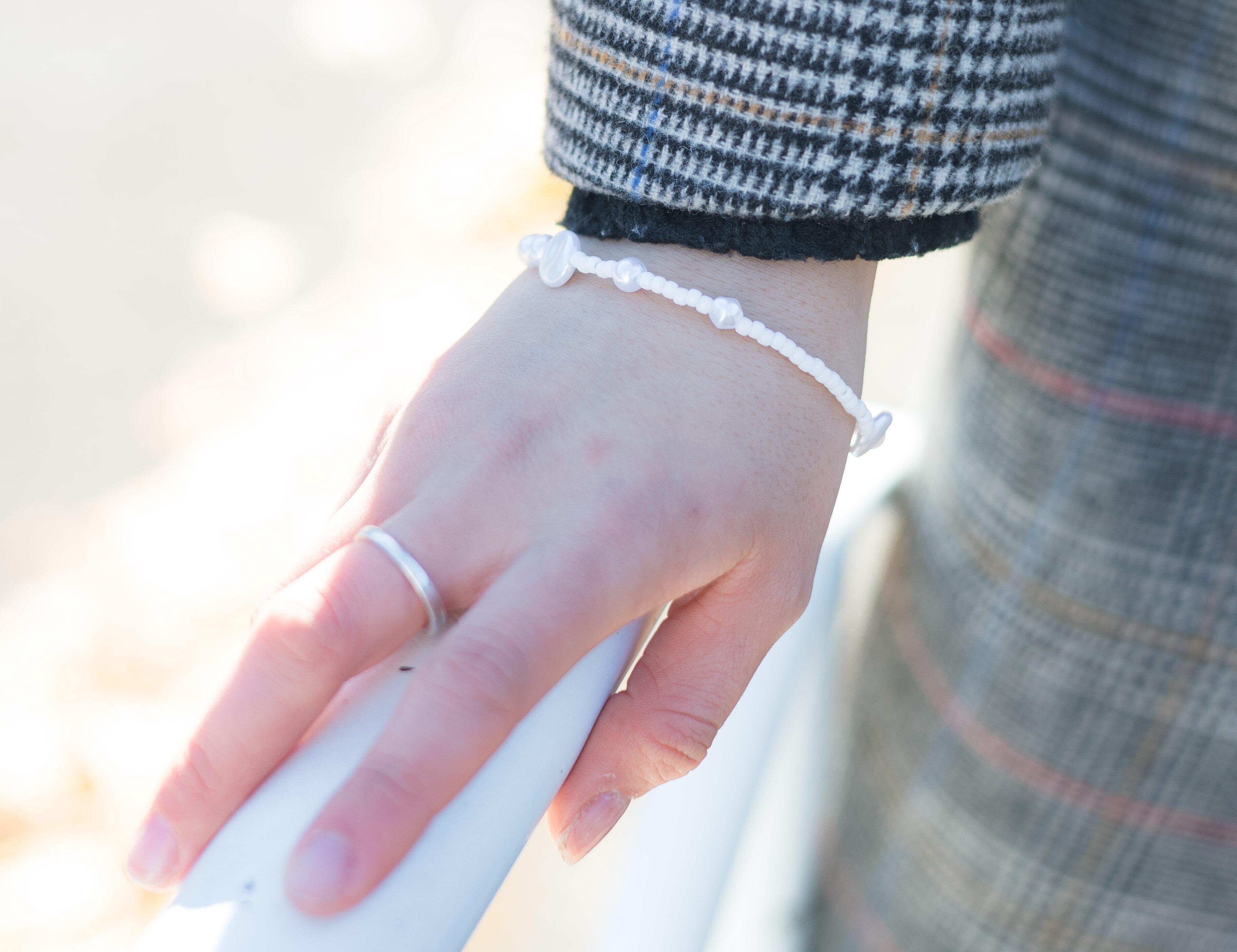 「今日のファッションのポイントは、古着屋さんで見つけたコートです。ブレスレットはカンボジア支援に取り組んでいる友人からのプレゼント。お守りのようにつけています」